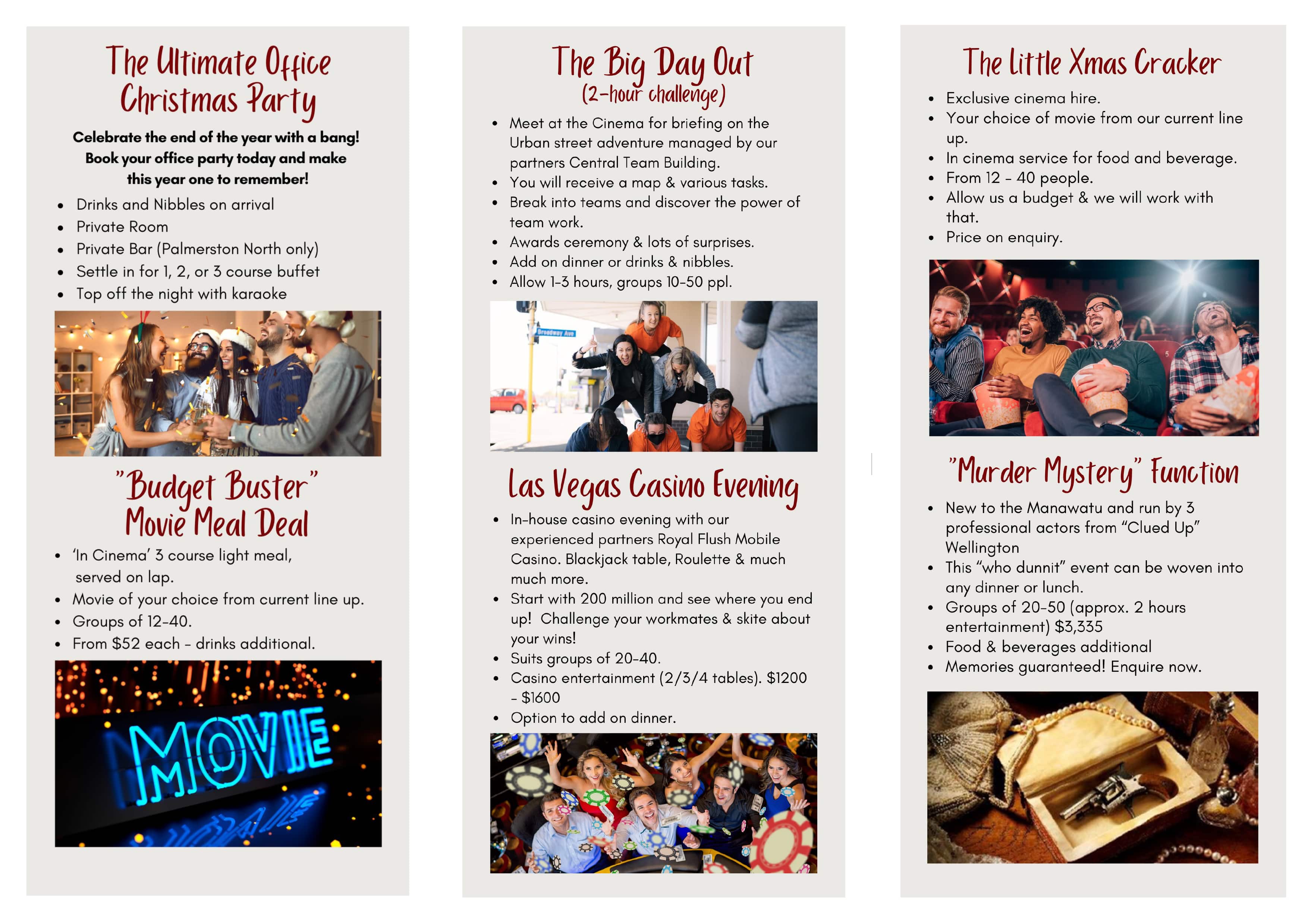 To find out about our range of function venues, Christmas ideas and tailored packages, please email functions@focalpointcinema.co.nz to enquire.